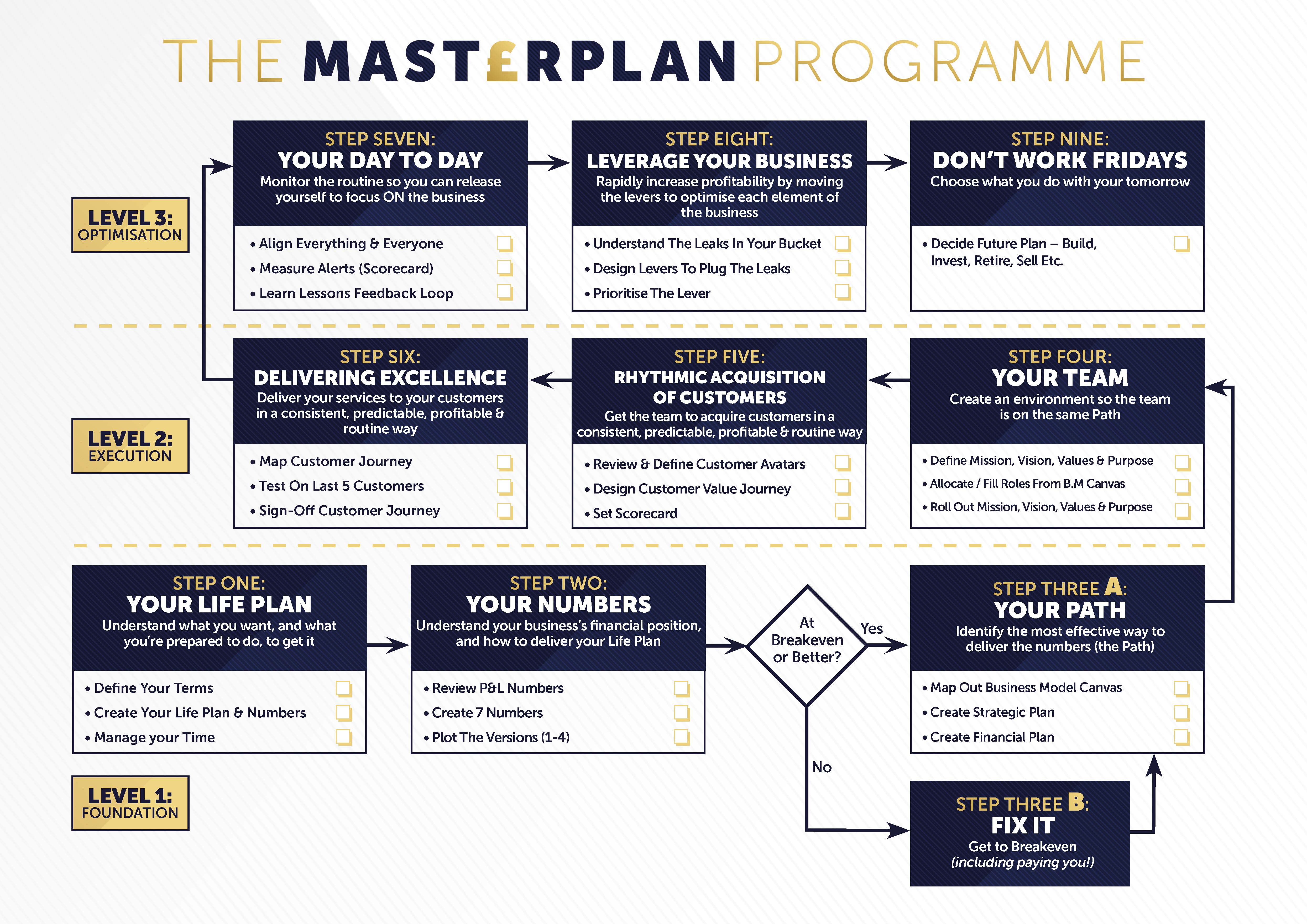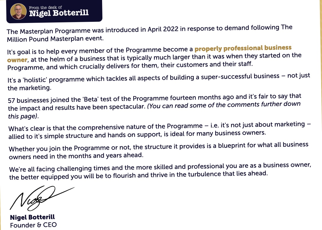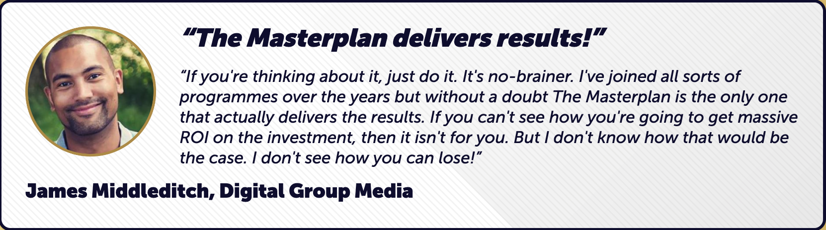 You'll get your own dedicated Masterplan Coach who is supported by each of our Specialists as you progress through each Step. In addition you'll get an input from Nicholas and other members of the team as required.